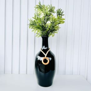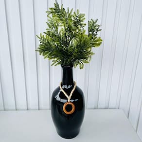 Decoração sala rack aparador vaso garrafa de cerâmica moderno liso na cor preto brilho com detalhe pingente de madeira e planta artificial.