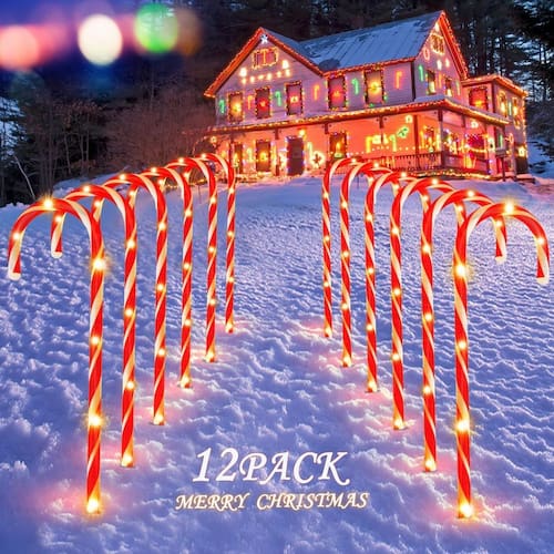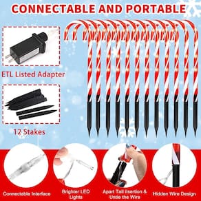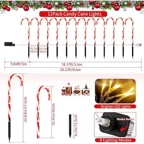 Decorações de Natal - Decoração de Natal: Instalação 2 em 1, no solo/suspensão: No solo (com estaca): Ideal para decorar a passarela, gramado, quintal, porta da frente, jardim, caminho e muito mais. Basta colocar o marcador de bengala doce e o bastão juntos e instalá-lo no chão. Pendurado: esta luminária de bengala doce pode ser pendurada na árvore de Natal, plantas, escadas, corrimão de escada, deck, pátio, janela, cerca e muito mais. Também é uma ótima opção de decoração de casa, deixe sua casa mais aconchegante neste feriado. - Decorações de Natal para pátio ao ar livre: dimensões dos bastões de doces para altura e comprimento: um fio tem 12 marcadores de caminho de bengala doce. Cada bengala doce tem 6 lâmpadas transparentes e tem 40,6 cm de altura (não inclui estaca de solo); A primeira bengala de doces até a última bengala de doces tem 18,37 m. O espaçamento entre cada bengala é de cerca de 50 cm. Para um comprimento total iluminado de aproximadamente 8,5 m. O tamanho da estaca de solo é de 15,5 cm. - Decorações de Natal em ambientes internos: fáceis de instalar: estas luzes de bengala de doces de Natal ao ar livre são resistentes e fáceis de instalar, para que você possa colocar as luzes na vertical em seu quintal. Tudo o que você precisa fazer é inserir a estaca no chão macio e também pode pendurá-las em uma árvore, janela, árvore de Natal ou parede. Perfeito para você decorar sua casa e dar a você uma atmosfera de Natal diferente. - Janela de decorações de Natal: atende às necessidades de 8 modos diferentes: esta luminária de bengala de doces de Natal atualizada tem 8 modos de iluminação. Estável, combinação, em ondas, sequencial, SLO-GLO, perseguição/flash, desbotamento lento, cintilante/flash. Você pode alterar facilmente o modo de iluminação no plugue. Luzes cintilantes tornarão sua exibição de férias mais atraente. Escolha um desses ou mude o modo de vez em quando para criar uma atmosfera divertida e romântica. - Decorações de Natal ao ar livre: vários usos: estas luzes de doces são seguras na neve e na chuva. Adequado para estradas, árvores, calçadas, sebes, cercas, canteiros de flores, casas, terraços, jardins, restaurantes, piscinas, entradas, Ano Novo, Páscoa, casamentos, festa de aniversário, feriado, festas, festivais, Dia dos Namorados, estas luzes de doces certamente lhe darão um Natal inesquecível.