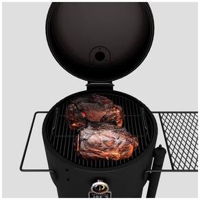 Cesta de carvão de grandes dimensões contém combustível suficiente por mais de 15 horas de tempo para fumar A construção de aço de bitola pesada oferece durabilidade construída para durar Medidor de temperatura montado em barril com detalhes brilhantes no escuro