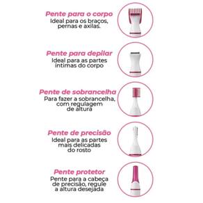 Prático e pode ser levado pra qualquer lugar. Suas 5 cabeças diferentes podem ser usadas para aparar sobrancelhas, virilha, narinas, axilas e face.