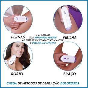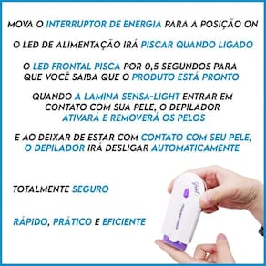 Depilador laser cor: branco remove com segurança os pelos de qualquer lugar, incluindo as pernas dos braços do rosto e a área do biquíni. O aparelho liga automaticamente ao entrar em contato com a pele e desliga ao afastar. Chega de métodos de depilação dolorosos. Bateria de lítio recarregável carregada por usb tornando-a perfeita para viagens. Tamanho compacto, fácil de transportar e armazenar. Como usar: - mova o interruptor de energia para a posição on. - o led de alimentação pisca quando ligado. - o led frontal pisca a 0,5 segundos para que você saiba que o produto está pronto. - quando a cabeça sensa-light entrar em contato com sua pele, o depilador ativará e removerá o cabelo enquanto a cabeça estiver contra sua pele. - o depilador irá desligar automaticamente desativar de 2 à 5 segundos depois de remover a cabeça sensa-light da sua pele. Especificações: cor: branco e roxo. Materiais: abs + pvc + ps. Adaptador de alimentação: 100 240v ac; 60hz/50hz
