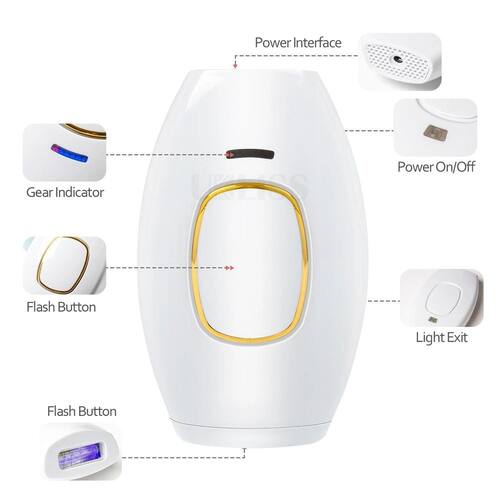 Depilador profissional à laser ipl 600. 000 flash, 5 níveis flash único + flash contínuo 2 modos de flash pequeno, elegante e portátil seguro sem efeitos colaterais, indolor. Inibição moderada da regeneração do cabelo. Aplicável ao corpo axila biquíni rosto barba braço pernas peças privadas. Nível ajustável 1-5. Atualize o filtro uv integrado sem danificar a pele. Atualize o sistema integrado de proteção de segurança para evitar danos instantâneos acidentais aos olhos. Somente o contato com a pele pode ser utilizado. Especificações do produto