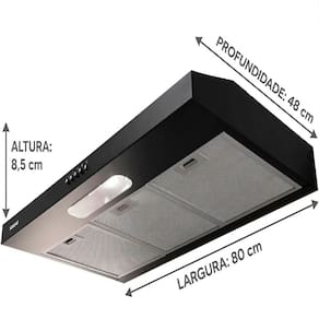 Caracteristicas tecnicas: Material de fabricacao: Telas em Aluminio Lavavel Capacidade de succao: 430 metros cubicos por hora Consumo: 0,12 kWh Potencia: 165W Velocidade: 3 velocidades Funcoes do Produto: Depurador de ar