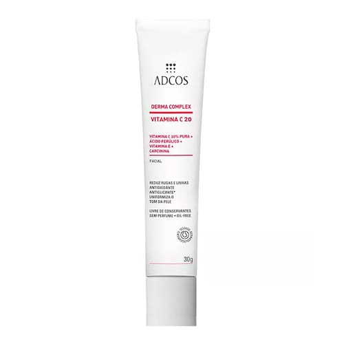DERMA COMPLEX VITAMINA C 20 ADCOS ANTIOXIDANTE CONCENTRADO O Derma Complex Vitamina C 20 possui fórmula que estimula a síntese de colágeno, clareia, uniformiza o tom da pele, corrige linhas finas e re