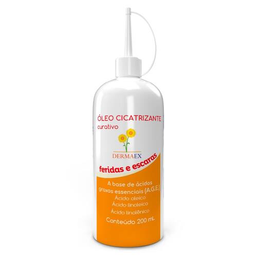 DERMAEX ÓLEO CICATRIZANTE À base de ácidos graxos essenciais (A.G.E.): Ácido oleico; Ácido linoléico; Ácido linolénico. Contém óleo de girassol (rico em ácidos graxos essenciais), triglicérides, cáprico/caprílico de cadeia média, ácido láurico, vitaminas A e E, lecitina de soja, óleo de soja e óleo de copaíba, indicados para: Aplicação em pele íntegra, para prevenção de úlcera por pressão; Feridas agudas e crônicas, com ou sem infecção de qualquer etiologia; Feridas com perda de tecido superficial e parcial; Dermatites peri-lesões; Queimaduras de primeiro e segundo graus; Dermatite amoniacal; Dermatites peri-gastrostomias, traqueostomias e drenos.