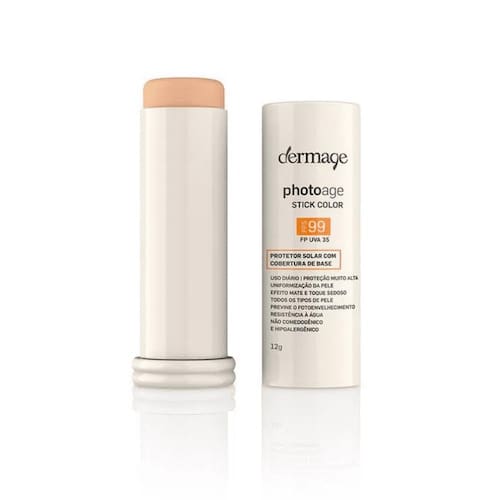 Dermage Photoage Stick Color FPS 99 cor Nude 12g Seu novo filtro solar com máxima proteção e cobertura de base! Com FPS99, máxima proteção solar disponível no mercado brasileiro e FPUVA 35, o Photoage Stick protege amplamente a pele contra os raios UVA, UVB e luz visível. Sua alta cobertura de efeito matte permite que seja usado no dia a dia, substituindo a maquiagem. Além disso, é ideal para a prática de esportes, sendo resistente à água e suor e adequado aos cuidados com o melasma.
