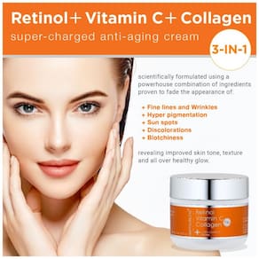 3 em 1 SUPER FÓRMULA PARA ILUMINAR Nosso creme facial tópico contém uma mistura de ingredientes clinicamente comprovados para combater os sinais de envelhecimento. Retinol, vitamina C e colágeno trabalham juntos para ajudar a reduzir a aparência de pele danificada, hiperpigmentação, descolorações, manchas escuras da idade e do fígado, manchas solares, pigmento associado a hormônios, pílulas anticoncepcionais e exposição diária ao sol, bronzeamento, erupções hormonais adultas , gravidez. Esta mistura potente também deixa a pele sedosa e macia.