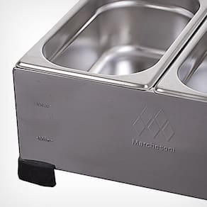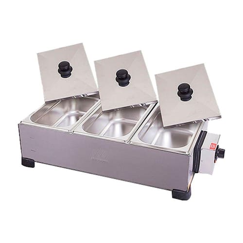 As Derretedeiras Marchesoni da Linha Industrial são perfeitas para derreter o chocolate de forma prática, rápida e adequada. Através do sistema de aquecimento em "banhomaria", conservam a consistência e o sabor do chocolate. Corpo em aço inox 430 e cuba gastronômica em aço inox 304 - Não enferruja; Com termostato regulável Seu chocolate sempre na temperatura ideal; Aquecimento em banhomaria: Não queima e não altera o sabor e as propriedades do chocolate; Acompanha tampa em inox; Ideal para derreter e manter derretido o chocolate; Indicado para Culinaristas, Docerias, Sorveterias, Buffets em geral (Hot Dog/Caldos/Sopas/Molhos/Alimentos). Utilização em casa e para cuidados pessoais como Derretedor de Cera Depilatória. Para terapias relaxantes como Aquecedor de Pedra. Modelo: DR.2.331/332 Capacidade: 10 kg (3 Cubas de 3,3 kg cada); Consumo: 750w / 0,75 kw/h; Alimentação: 127v ou 220v; Medidas do Produto (CxAxL): 61 x 20 x 34 cm; Medidas da Embalagem (CxAxL): 62 x 30 x 40 cm; Peso Líquido: 4,6 kg; Peso Bruto: 5,8 kg.