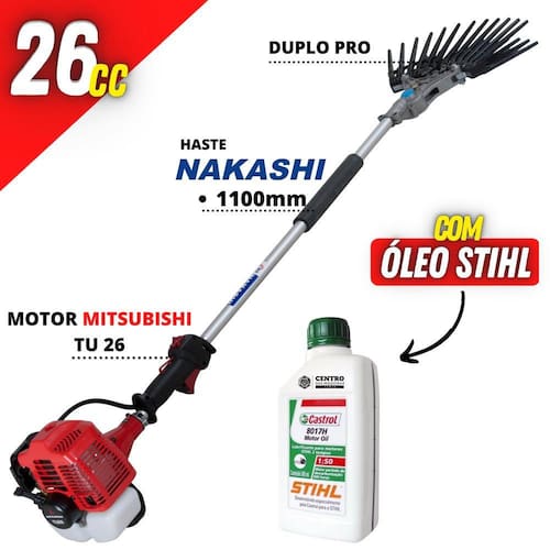 Derriçadeira Profissional Nakashi DL262MD com Haste 1100mm Motor Mitsubishi TU26 de 25,6cc e Kit Duplo Pro+ Óleo Castrol Stihl 500ml