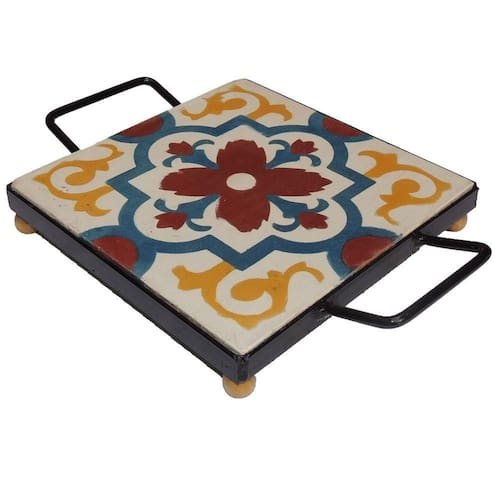 Linha em ferro com ladrilho hidráulico super estiloso e de alto requinte para servir o seu almoço. Impede que as travessas quentes danifiquem as mesas. Produto que possui alta durabilidade, totalmente leve e que proporciona praticidade e elegância na hora das refeições. Em seu superior revestido de azulejo decorado com pinturas peculiares, trazendo elegância e um estilo rústico para sua cozinha.