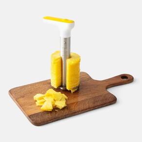 Com o Twist'n Core Pineapple Tool da Chef'n, você pode desfrutar de um abacaxi fatiado suculento e ainda ter uma casca oca perfeita para sua bebida tropical. A lâmina de aço inoxidável de dois gumes permite descaroçar e extrair a fruta da casca de forma eficiente e rápida.