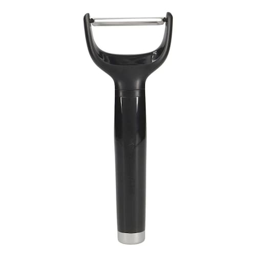 O descascador KitchenAid Y tem um design elegante e elegante que torna o descascar frutas e legumes simples. Este descascador Y possui uma lâmina reta de borda única construída de aço inoxidável 420 resistente à ferrugem. O cabo ergonômico do descascador oferece uma aderência segura e confortável quando em uso. O cabo ABS brilhante possui um logotipo em relevo, bem como um reforço e extremidade cromados de cetim ABS. O descascador em Y é completamente seguro para lava-louças para facilitar a limpeza e vem com uma bainha protetora para armazenamento.