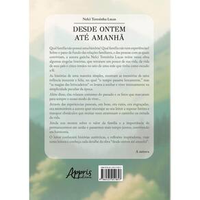 Qual família não possui uma história? Qual família não tem experiências? Sobre o pano de fundo das relações familiares, e das pessoas com as quais conviviam, a autora gaúcha Nelci Teresinha Lucas reúne nessa obra algumas singelas histórias, que retratam um pouco de sua vida, da vida de seus pais e cinco irmãos no seio de uma mãe que tinha como escudo a fé. As histórias de uma maneira simples, mostram as memórias de uma infância inocente e feliz, no qual “o tempo passava lentamente,” mas “as magias das brincadeiras” os levava a sonhar e viver intensamente na simplicidade peculiar da época. Além disso, elas relatam costumes do passado e os fatos que marcaram para sempre o nosso modo de viver… Através das experiências pessoais, ora boas, ora ruins, ora engraçadas, ora memoráveis a autora quer encorajar ao seu leitor a superar limites e transpor obstáculos que muitas vezes atravessam o caminho na estrada da vida. Ainda nos mostra sobre o valor da família e a importância de permanecermos em união e passarmos mais tempo juntos, convivendo em harmonia. O leitor conhecerá histórias autênticas, e reflexões inspiradoras, viaje nessa leitura e conheça cada detalhe da obra “desde ontem até amanhã”. A autora Marca: ARTERA EDITORA Ean: 9786525051857