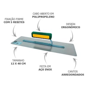 Contém: 1 Desempenadeira em Aço Inox com cabo aberto e canto arredondado, tamanho 12x40cm.