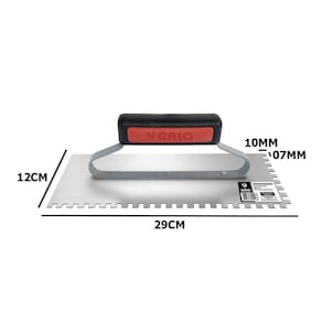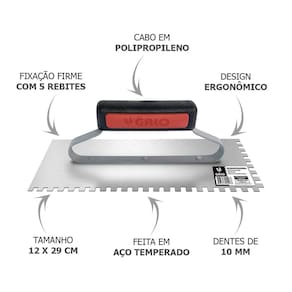 Benefícios: - Alta durabilidade graças ao aço temperado. - Cabo ergonômico que oferece melhor controle e segurança. - Base dentada que permite uma distribuição uniforme da argamassa.