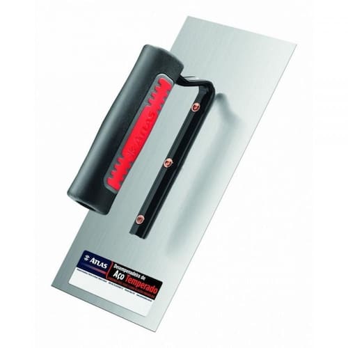 Desempenadeira de aço lisa e cabo plástico com uma haste de fixação aberto.