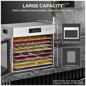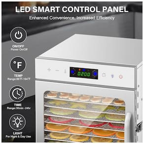 Este desidratador de alimentos é fácil de limpar e durável, com um corpo de aço inoxidável que pode ser facilmente limpo com um pano úmido. Todas as bandejas podem ser lavadas na máquina de lavar louça, eliminando preocupações sobre possíveis riscos à saúde associados ao uso de bandejas plásticas de secagem.
