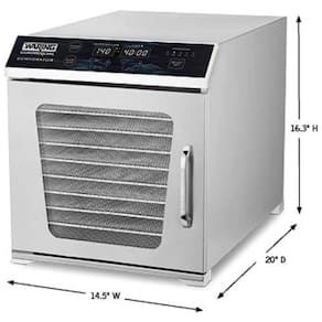 Material: Aço inoxidável Cor Prata Potência 800 watts Tensão 120 Volts Peso do item 18,59 kg Número de bandejas 10 UPC 040072086281 Dimensões do produto 50,80 cm x 38,10 cm x 40,64 cm Número do modelo do item WDH10