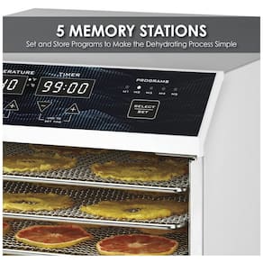 Equipado com controles intuitivos em uma tela sensível ao toque, o Waring WDH10 simplifica o processo de desidratação. Possui um display LED digital completo com controles de toque capacitivos e cinco memórias programáveis para armazenar configurações personalizadas. As dez prateleiras de malha oferecem ampla área de secagem, cada uma medindo 38 cm x 34 cm.