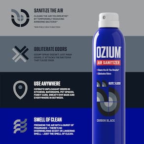 - Mais do que apenas um purificador de ar: o spray desinfetante de ar OZIUM não é o seu aromatizador de ar típico de casa ou carro, faz com que os odores desapareçam reduzindo bactérias e germes causadores de odor.