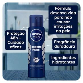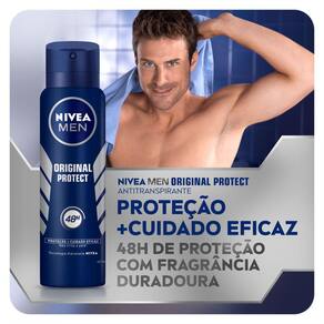 O Desodorante Aerosol Nívea Men Protect é um antitranspirante de qualidade que mantém as axilas livre de transpirações e de ressecamento e ainda ajuda a prevenir irritação na pele. Garante alta proteção contra o suor e dos maus odores. Além disso, proporciona até 48 horas contra a transpiração excessiva.