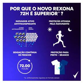 Sobre a marca: Lançada no Brasil em 1969, Rexona, marca da Unilever, é líder do mercado brasileiro de desodorantes. A marca tem consolidado e ampliado sua presença por meio de uma constante inovação em sua linha de produtos, formulações e embalagens. Rexona é, há 16 anos, a primeira marca de desodorantes que vem à cabeça do consumidor brasileiro, de acordo com a pesquisa Top of Mind do Instituto Datafolha. Rexona te dá a confiança necessária para enfrentar os desafios do dia a dia. Com a exclusiva tecnologia de Rexona, que libera proteção adicional conforme a necessidade, você sabe que seu desodorante não vai te deixar na mão. Melhor ainda, hoje a marca oferece produtos que atendem às necessidades específicas dos consumidores através das linhas Rexona Women, Rexona Men e Rexona Teens.