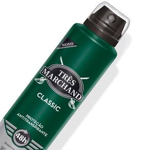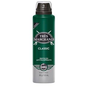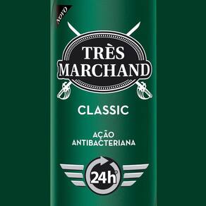 O Desodorante Aerosol Tres Marchand Classic foi especialmente desenvolvido com notas Cítricas, com um leve toque amadeirado destacando assim personalidade masculina. Sua Fórmula proporciona 48 horas de proteção, deixando uma sensação de segurança e bem estar durante o dia, Além de possuir Fórmula antitranspirante.
