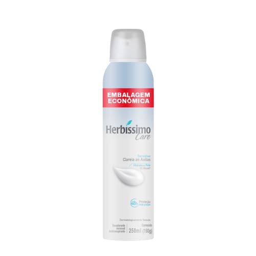 Desodorante Aerossol Antitranspirante Herbíssimo Care Sensitive é formulado com uma exclusiva tecnologia clareadora que cuida da pele, promovendo uma aparência uniforme e mantendo as axilas lindas e saudáveis. Ele clareia as axilas, hidrata a pele e oferece 48 horas de proteção e hidratação, sendo dermatologicamente testado e livre de álcool. Especificações: 0% ÁlcoolProteção e hidratação por 48 horasDermatologicamente testadoPrecauções:Inflamável. Não pulverizar perto do fogo.Não perfurar nem incinerar.Não expor ao sol nem a temperaturas superiores a 50ºC.Usar somente nas axilas e proteger os olhos durante a aplicação.Manter fora do alcance de crianças.Evitar inalação deste produto.Usar somente nas áreas indicadas.Não aplicar sobre a pele irritada ou lesionada.Caso ocorra irritação e/ou prurido no local da aplicação, suspender o uso imediatamente.Não deixar embalagem de aerossol dentro de veículo, pois há risco de vazamento e explosão.Importante: Inofensivo para a camada de ozônio. Não contém CFC.Uso externo. Não ingerir.