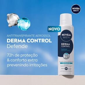 NIVEA MEN Desodorante Aerossol Derma Control Defende é um antitranspirante desenvolvido para oferecer proteção intensa contra o suor e o mau odor, cuidando da pele das axilas com uma fórmula especial que inclui Ácido Hialurônico e Pró-Vitamina B5.