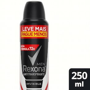 Nova Fórmula: 72 horas de proteção contra a transpiração e o mau odor, ativada pelo movimento. O novo Rexona combina um inovador ativo antitranspirante com a exclusiva tecnologia de fragrância encapsulada. Te mantendo seco e protegido como nunca antes. *Excluindo produtos Clinical. **Vs antitranspirantes comuns em aerosol. Testado cientificamente e validado por consumidores brasileiros. 84% dos consumidores que experimentaram o produto afirmam que trocariam o seu antitranspirante atual pelo Novo Rexona. *Pesquisa realizada com consumidores do principal concorrente. Sua tecnologia protege a roupa contra manchas brancas e amarelas. Não contém álcool etílico / 0% de álcool etílico. Testado dermatologicamente.