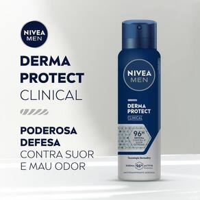 NIVEA MEN Desodorante Antitranspirante Aerossol Derma Protect Clinical é um desodorante masculino desenvolvido para oferecer proteção extrema contra o suor e mau odor. Sua fórmula protege a pele, deixa a axila suave, macia e sem irritação.