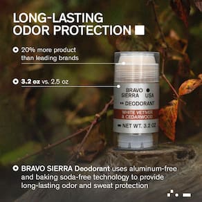 Proteção de odor de longa duração: o desodorante Bravo Sierra usa tecnologia sem alumínio e sem bicarbonato de sódio para fornecer proteção duradoura contra odor e suor, mesmo nas condições mais exigentes. Nosso perfume autêntico é amadeirado com notas de vetiver branco e cedro. Pacote com 2.