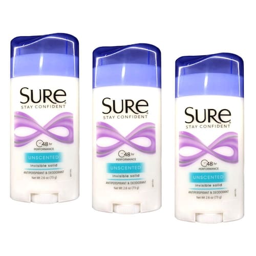 Sure Desodorante 74 g invisível sólido sem perfume (pacote com 3) - Tipo de produto: desodorante corporal - Dimensão do pacote do item: 5,689 cm C x 10,109 cm L x 13,589 cm A - Peso do pacote do item: 0,34 kg - País de origem: Estados Unidos
