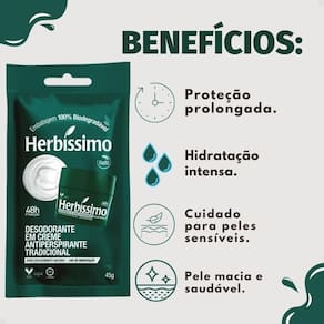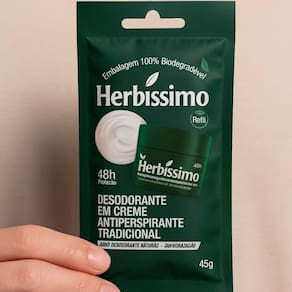 Desodorante Em Creme Refil Herbíssimo Tradicional Antiperspirante 45g Garanta proteção eficaz e duradoura contra o suor e o mau odor com o Desodorante Em Creme Refil Herbíssimo Tradicional Antiperspirante 45g. Desenvolvido pela tradicional marca HERBISSIMO, este refil é a escolha inteligente para quem busca economia sem abrir mão da qualidade e do cuidado com o meio ambiente. Sinta a confiança de estar protegido o dia todo, com uma fórmula suave que hidrata a pele e evita irritações. Ideal para homens e mulheres que prezam por praticidade e bem-estar, este refil é perfeito para manter a sua rotina de higiene pessoal em dia, com a vantagem de um produto sustentável e econômico.