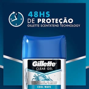 Os antitranspirantes Clear gel da Gillette oferecem proteção antibacteriana por até 48 horas contra 99% das bactérias que geram o odor corporal. Ele também fornece fragrância que dura o dia todo.