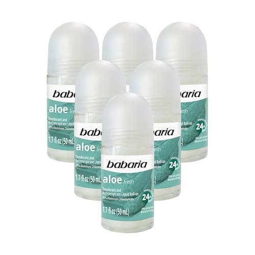 Desodorante Babaria Roll-On, Aloe — Antitranspirante sem álcool para mulheres e homens com proteção 24 horas — Desodorante hidratante antisuor — 6 unidades — Controle de odor e antitranspirante: diga adeus aos odores desagradáveis! Nosso desodorante feminino roll-on combate eficazmente o odor e, ao mesmo tempo, atua como antitranspirante.