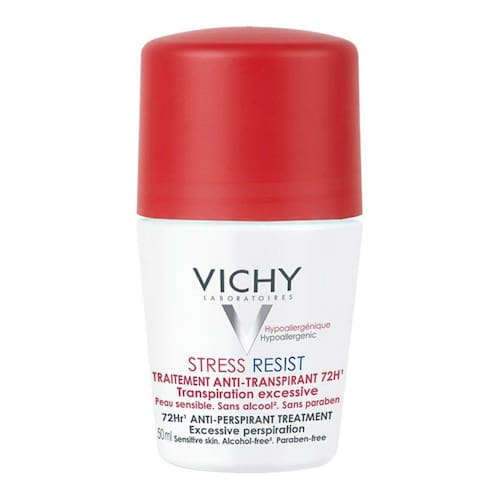 Desodorante Roll On Vichy Dermatológico Stress Resist 72h 50ml é um desodorante antitranspirante que regula a transpiração excessiva por até 72 horas. Formulado com Água Termal de Vichy, este produto é hipoalergênico, não contém álcool e pode ser aplicado nas axilas, mãos e pés. Com o Desodorante Vichy Stress Resist, você estará protegido até mesmo em situações de stress.