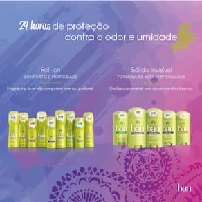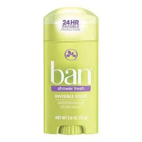 Benefícios e diferenciais do desodorante Ban Shower Fresh Invisible Solid Ação antitranspirante de alta performance. Desliza nas axilas com toque seco. Cria uma barreira de proteção contra a transpiração e o odor indesejado. Proteção por até 24 horas. Absorvido rapidamente pelos poros sudoríparos. Não deixa manchas brancas nas roupas. Fragrância refrescante com essência floral e leves notas frutadas. Para transpiração normal a excessiva. Não é um desodorante clínico.