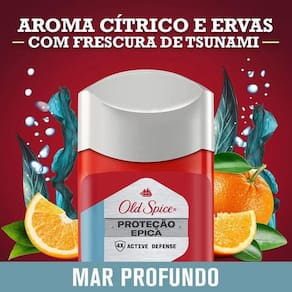 O Desodorante Stick Old Spice Mar Profundo pensado exclusivamente para homens que possui uma transpiração excessiva e desconfortável. Desenvolvido com uma formula que corta o suor como um lenhador com sua poderosa motosserra. Garante sensação de bem estar e refrescância por muito mais tempo. O Desodorante Stick Old Spice Mar Profundo forma uma camada bruta durante o dia todo com apenas 1 aplicação nas axilas sem causar ressecamento e irritações na pele.