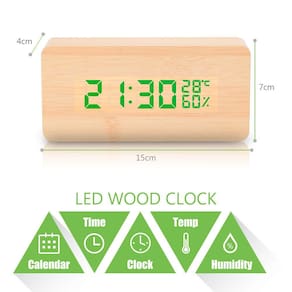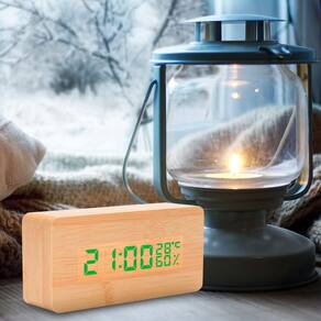 Despertador digital Material do despertador: plástico com madeira Dimensão: 15x7x4cm Fácil de carregar: cabo de carregamento ou com 3 pilhas AAA (NÃO INCLUÍDAS). Veja menos