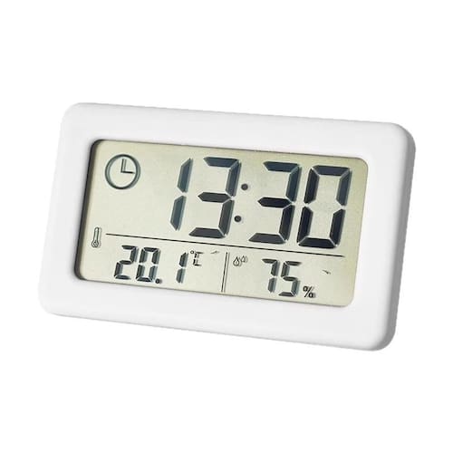 Material: plástico Tamanho: 9,6* 1* 5,8 cm Peso: 120 g Display multifuncional: este despertador digital possui uma tela LCD que mostra a hora, temperatura e umidade atuais, tornando-o uma adição prática a qualquer mesa ou mesa de cabeceira. Design compacto e moderno: com seu design elegante e pequeno e corpo de plástico branco, este relógio se encaixa facilmente em qualquer escritório, espaço de estudo ou quarto, adicionando um toque de modernidade. Tela LCD clara e fácil de ler: a tela grande e clara garante que você possa ler facilmente os níveis de tempo, temperatura e umidade à distância, tornando-a perfeita para o uso diário. Monitoramento preciso de temperatura e umidade: com sensores integrados, este relógio fornece informações em tempo real sobre temperatura e umidade, ajudando você a manter um ambiente confortável. Perfeito para desktop ou mesa: o design pequeno e leve torna este relógio ideal para ser colocado em sua mesa, mesa de cabeceira ou em qualquer lugar em que você precise de um relógio compacto e funcional.