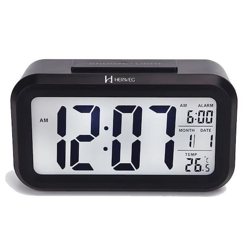 Despertador Digital Preto Herweg 2988-034 único - Características Gerais do Produto: Alimentação: Usa pilha palito AAA não inclusa Funcionalidade: Calendário; Visualização em 12h ou 24h; Termômetro; Iluminação Noturna; Soneca; Alarme com som crescente Material: Plástico injetado Medidas: A: 14,0 x L: 7,0 x P: 5,0 cm Observações: Botões de regulagem na parte superior; Modelo referência do produto: 2988-034 Acompanha o produto: 01 Relógio Despertador de 12 meses do Fabricante Manual de Instruções : 12 Meses de de Fábrica Ean: 7897280312991