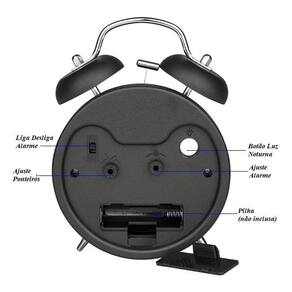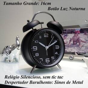 Despertador silencioso sem tic tac alarme sino som alto a8 Tamanho grande: 15,9 x 11,5 x 5,9 cm Ponteiro silencioso - sem barulho de tic tac Despertador barulhento - sinos de metal Relógio despertador analógico de ponteiro com despertador alto. Desperta com sinos. Pilhas não inclusas. Obs. Utilizar somente pilhas novas de boa qualidade, de preferência alcalina. Só não acorda se estiver morto. São 2 sinos metálicos que desperta até defunto Não se atrase mais Esse acorda do sono mais profundo Funciona com apenas 1 pilha aa (não inclusa) Especificações: Sinos em metal Relógio analógico tem a função de despertador. Botão liga- desliga alarme. Tamanho grande: 15,9 x 11,5 x 5,9 cm Perguntas frequentes: Pergunta: vocês testam antes de enviar Resposta: sim todos testados individulamente um a um antes de postar Pergunta: os sinos que ficam em cima dele são acionados no alarme certoResposta: sim o som do despertador é feito pelos sino em cima do despertador Pergunta: dá para ver a hora a noite no escuroResposta: o relógio tem uma luz que pode ligar apertando o botão atras Pergunta:como programar a hora e meia Resposta: nesse caso você precisa colocar o ponteiro do despertador no meio do numero, por exemplo se você quiser que o relógio desperte as 7:30 você coloca o ponteiro do despertador entre o 7 e 8 assim ira despertar as 7:30. Pergunta:como distingue seis da manhã de seis da tardeResposta: como é um relógio de ponteiro ele não tem essa função mostra somente horário em 12 horas Pergunta: como faco pra colocar alarme neleResposta: o despertador é regulado atras do relogio Pergunta: esse despertador tem a função soneca Resposta: boa tarde não tem função soneca Pergunta: ele só desperta com números inteiros tipo 1 hr, 2hrs, 3hrs Não desperta se coloca tipo, 11:30 ou 10:45 Vi nos comentários de avaliação.Resposta: sim pode despertar em qualquer horário, por exemplo para despertar as 7:30 você colocaria o ponteiro do despertador entre o 8 e 7 assim despertando as 7:30 Pergunta: o barulho é alto Resposta: sim o som do despertador é bem alto Pergunta: tem botão pra desligarResposta: tem botão para ligar ou desligar a função despertador Marca: Ruike