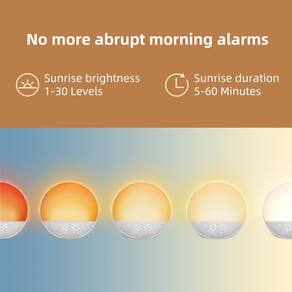 - Despertar suavemente com o despertador Sunrise: a simulação do nascer do sol se ilumina gradualmente ao longo de 5 a 60 minutos personalizáveis antes da hora do alarme definida, alinhando-se com o ritmo circadiano para um início de dia tranquilo e sem desconforto.