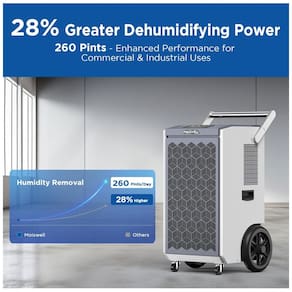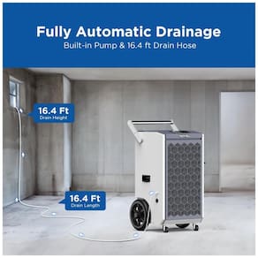 Capacidade de Desumidificação Elevada de 71 cm. Combata a umidade com facilidade usando o desumidificador comercial Moiswell, oferecendo uma impressionante capacidade de desumidificação de 123 litros por dia. Ideal para espaços grandes como porões, garagens, armazéns e áreas comerciais, projetado para remover umidade excessiva de forma eficiente. Bomba Integrada para Drenagem Sem Complicações Nosso desumidificador conta com uma inovadora bomba integrada que drena automaticamente a condensação, eliminando a necessidade de descarte manual de água. Este desumidificador comercial é capaz de bombear água vertical ou horizontalmente por 5 metros, a mangueira de drenagem de 5 metros inclusa oferece flexibilidade na instalação, podendo ser colocado onde for necessário, sem a dificuldade de posicioná-lo em superfícies elevadas para drenagem adequada. Rodas Grandes de 25,4 cm e Alças Removíveis Projetado para máxima portabilidade, este grande desumidificador possui alças removíveis que facilitam o levantamento e movimentação. Com rodas traseiras grandes de 25,4 cm, este desumidificador é perfeito para mover-se em diversas superfícies, incluindo terrenos acidentados, garantindo transporte sem esforço para onde for mais necessário. Painel de Controle de Fácil Utilização para Operação Simplificada O painel de controle do nosso desumidificador foi projetado pensando na conveniência do usuário. Com botões intuitivos e display claro, permite ajustar facilmente as configurações de umidade e monitorar os modos de operação. Essa interface direta garante que qualquer pessoa consiga operar o desumidificador de forma eficaz, sendo uma escolha ideal tanto para uso residencial quanto comercial. Desumidificador Durável para Qualquer Ambiente O desumidificador é construído com componentes de cobre de alta qualidade, garantindo durabilidade de longo prazo e desempenho confiável em ambientes exigentes como locais de construção. Sua função de descongelamento automático impede o acúmulo de gelo nas bobinas, permitindo operação contínua. A unidade também oferece um modo de drenagem contínua com conexão de mangueira por gravidade, ideal para casas de férias e áreas comerciais movimentadas.