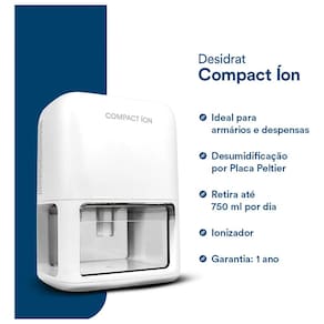 Ideal para quartos, banheiros, armarios, lavanderias e ate mesmo para combater a umidade em carros, o Desumidificador Compact Ion Branco e a solucao perfeita para criar um ambiente mais confortavel e salubre. Seu uso e simples e direto, bastando conecta-lo a tomada para comecar a sentir a diferenca na qualidade do ar. Perfeito para quem busca mais bem-estar e protecao contra os efeitos negativos da alta umidade. Marca: Não Informado