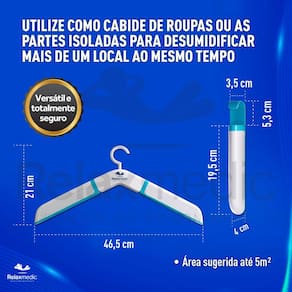 É uma verdadeira inovação em formato de cabide, perfeito para o seu guarda-roupas! O desumidificador também pode ser desmontado para que as partes isoladas sejam utilizadas em lugares menores. Dessa maneira, você desumidifica mais de um local ao mesmo tempo. É possível até mesmo colocá-lo dentro dos calçados!