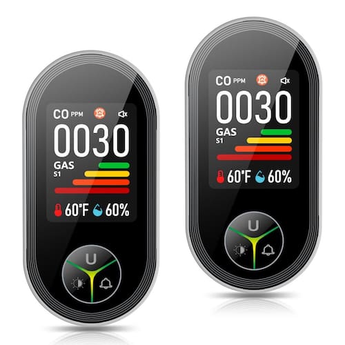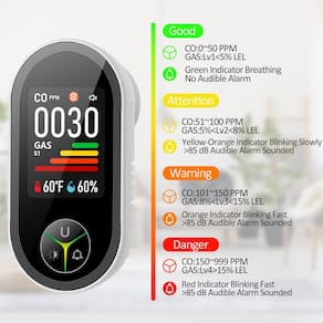 - Sensores de alta sensibilidade e sistema de alarme duplo: este detector de monóxido de carbono tem sensores duplos e alarmes duplos projetados com alarmes de luz audível e intermitente, que são ativados quando a concentração de gás atinge os limites de alarme (monóxido de carbono = 51PPM ou gás combustível = 5% LEL). Ele emite um alarme alto = 85 dB e pisca a luz colorida correspondente ao nível, alertando você e sua família imediatamente em caso de vazamento.