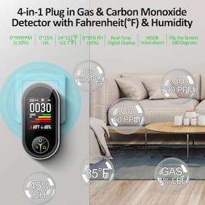 - Detector plug-in 4 em 1 atualizado: o sistema de monitoramento Kalawen 4 em 1 combina detecção de gás combustível, detecção de monóxido de carbono, monitoramento de temperatura e medição de umidade em um dispositivo compacto. Esta solução multifuncional oferece avaliações de segurança ambiental em tempo real, rápidas e precisas. Os gases detectados incluem: CO, gás natural, propano, metano, gás urbano, álcool, gasolina, hexano, butano, benzeno, óxido de etileno, acetileno, GLP, GNL e muito mais.