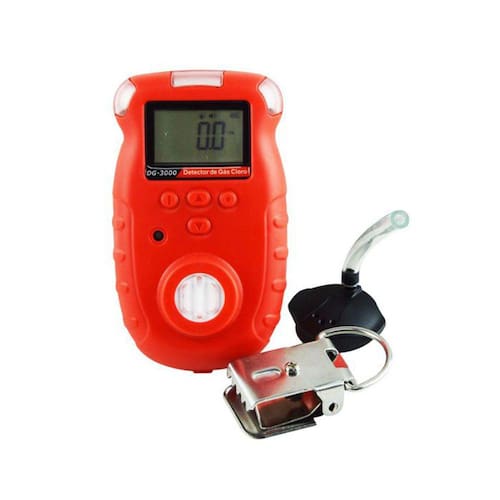 DETECTOR DE CLORO MOD. DG-3000 DIGITAL PORTÁTIL, FAIXA DE MEDIÇÃO DE 0 A 20PPM DESCRIÇÃO: O detector de cloro mod. DG-3000 pode detectar continuamente o conteúdo de cloro no ar e pode ser utilizado como alarme de vazamento em encanamentos subterrâneos ou minas, o que mantém a segurança das pessoas e previne a destruição de equipamentos. Este detector, dotado de um sensor de excelente qualidade, detecta através da difusão. Possui ótima sensibilidade e controlador MCU, de fácil operação. O corpo deste instrumento é feito de material extremamente resistente e coberto com borracha antiderrapante, o que evita a infiltração de água e poeira. CARACTERÍSTICAS: Controle MCU Display de cristal líquido (LCD) Nível de alarme alto e baixo, o tipo de alarme é indicado no display O nível de calibração pode ser especificado Grau de Proteção: IP-65 (Protegido contra poeira e respingo de água) Possui indicação de erro no funcionamento do sensor, auto medição e bateria fraca Indicação da hora atual Módulo do sensor substituível Função de auto-ajuste Dois níveis e três alarmes ternários Gerenciamento de senha e confirmação de senha para operações importantes. Carregamento e armazenamento de dados ESPECIFICAÇÕES TÉCNICAS: Display: LCD de 4 dígitos Escala: 0 a 20ppm Escala de alarme alto: 5 a 15ppm Escala de alarme baixo: 3 a 10ppm TWA: 5ppm STEL: 10ppm Tipo de gás: cloroPrecisão: ±5% do fundo de escala Tempo de resposta: ?30s Indicação: O display indica a hora, modo de alarme, mal funcionamento, baixa tensão da bateria e alarme. Alimentação: Bateria de lítio de 3,6V DC; 1200Ah Tempo de carregamento da bateria: 4h às 6h Duração da bateria: Aprox. 8 horas Vida útil do sensor: Aprox. 1 ano Temperatura de operação: -40 a 70°C Umidade de operação: ?90%U.R. Dimensões: 98 x 52x 40 mm Peso: Aprox. 200g ACESSÓRIOS FORNECIDOS: Chave Philips Clipe de cinto tipo jacaré Clipe de cinto simples Mascará para espaço confinado Carregador Estojo para transporte Manual de instruções